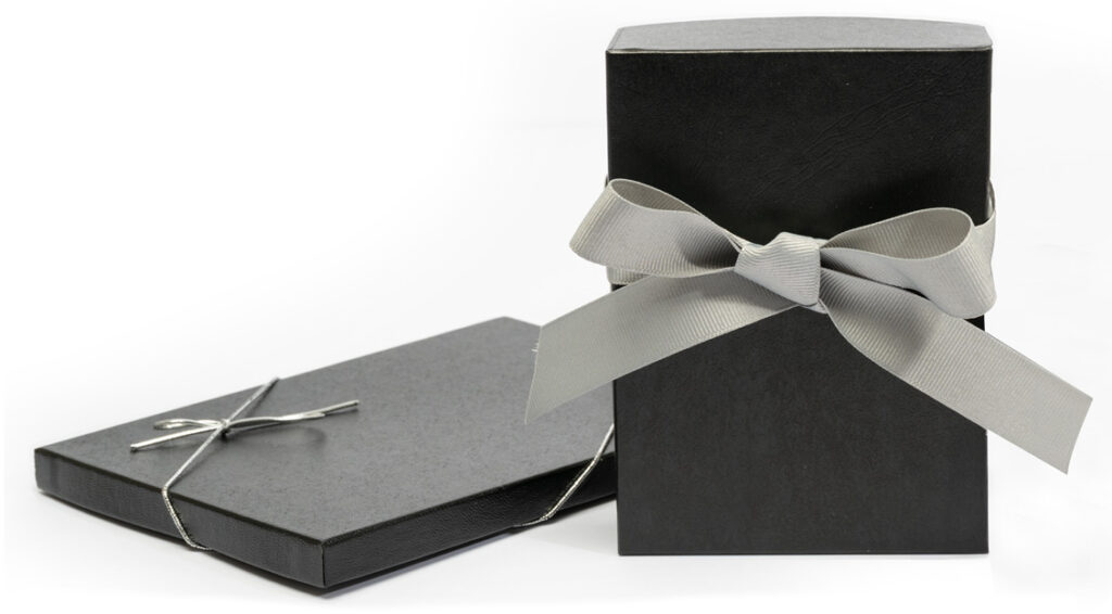 Make a sophisticated impression with our rich black textured two-piece boxes featuring elegant silver stretch loops. Each order is carefully packaged with prints in clear poly sleeves, beautifully finished with black tissue for a premium unboxing experience. These versatile presentation boxes are perfect for:
