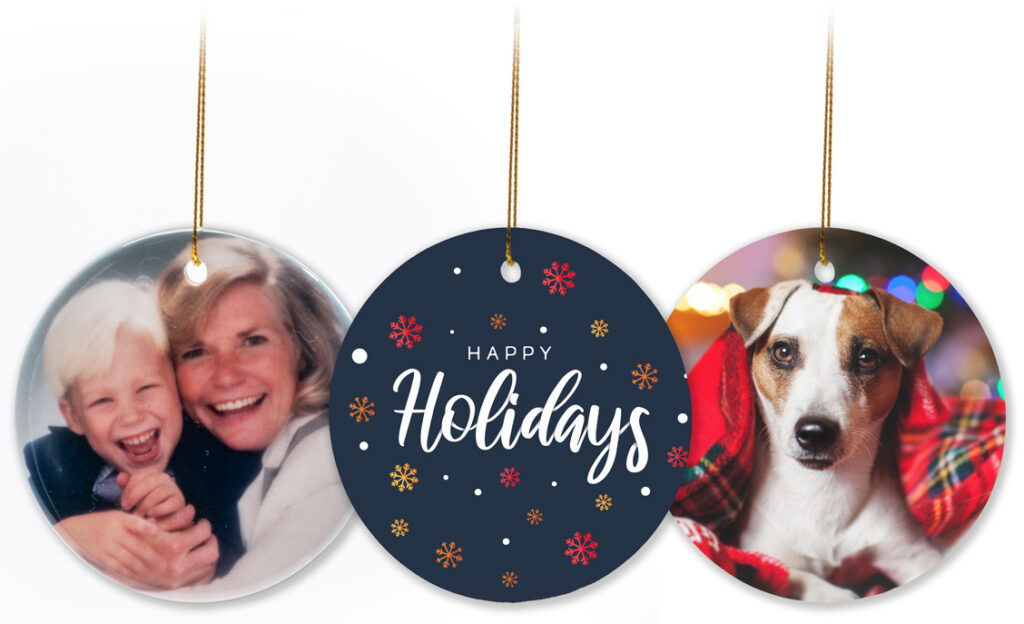 Create lasting holiday traditions with our custom photo ornaments. Available in both premium porcelain and lightweight plastic options, these two-sided ornaments can be personalized with images, dates, and messages. Choose from our seasonal template collection with designs that coordinate with our holiday card templates for consistent branding.